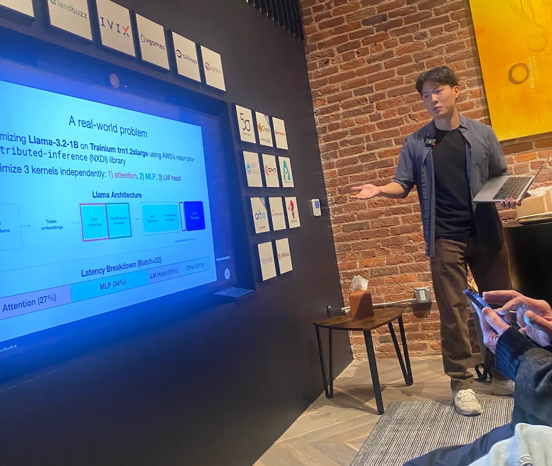 Charles Hong (Ph.D UC Berkeley) shared work that could challenge Nvidia’s vendor lock-in. He demonstrated how LLMs could effectively compile code to different types of hardware quickly and efficiently, enabling developers to write to multiple platforms without special knowledge. Several people stayed after to debate what this means for the future of chip development!